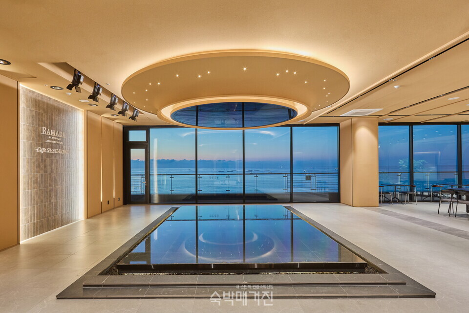 라마다 속초는 로비, 객실, 카페 등 대부분의 공간에서 오션뷰를 확보해 인테리어 전반에 걸쳐 바다라는 자원을 적극적으로 끌어들이고 있다. 투숙객들이 제일 먼저 체험하게 되는 로비는 높은 천장과 아치형 구조를 중심으로 설계되어 공간이 주는 개방감과 고급스러움을 극대화하고 있다. 바닥과 벽인 밝은 톤으로 마감해 시각적으로 넓고 환한 인상을 준다.