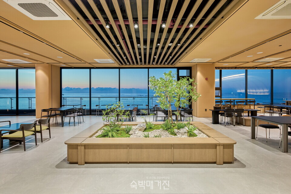 단순히 체크인을 위한 공간이 아니라 투숙객들이 경험하는 첫 무대가 되도록 디자인됐다. 카페 공간의 좌석 배치는 다양한 그룹과 개인 고객을 모두 수용할 수 있도록 긴 테이블과 작은 테이블이 병행되어 사용됐다. 이는 단순한 휴식 공간을 넘어 워케이션·미팅 등 다목적 활용을 가능하게 할 것으로 보인다. 라마다 속초의 실내 디자인은 전반적으로 미니멀리즘을 바탕으로 한다. 절제된 색채와 소재에 목재와 대리석 질감을 은은하게 활용해 공간의 고급스러움을 강조하면서도 시선은 외부 경관에 머물도록 유도한다.